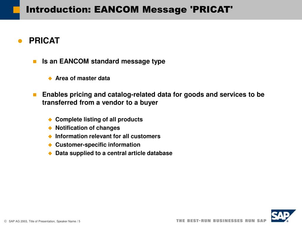 Introduction: EANCOM Message 'PRICAT' • PRICAT • Is an EANCOM standard message type • Area of master data • Enables pricing and catalog-related data for goods and services to be transferred from a vendor to a buyer • Complete listing of all products • Notification of changes • Information relevant for all customers • Customer-specific information • Data supplied to a central article database