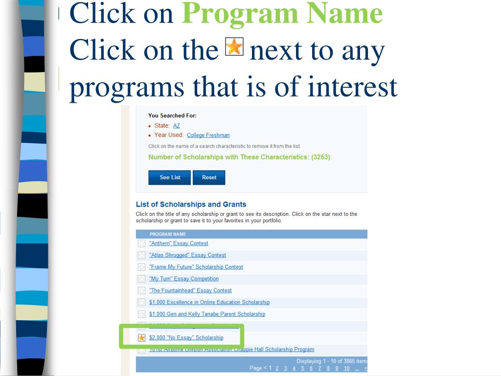 Don’t • Never pay to apply for a scholarship! • Don’t waste your money on scholarship search services that promise to help you tap into vast amount of unclaimed financial aid funds. There are many web sites that provide the same information for FREE.