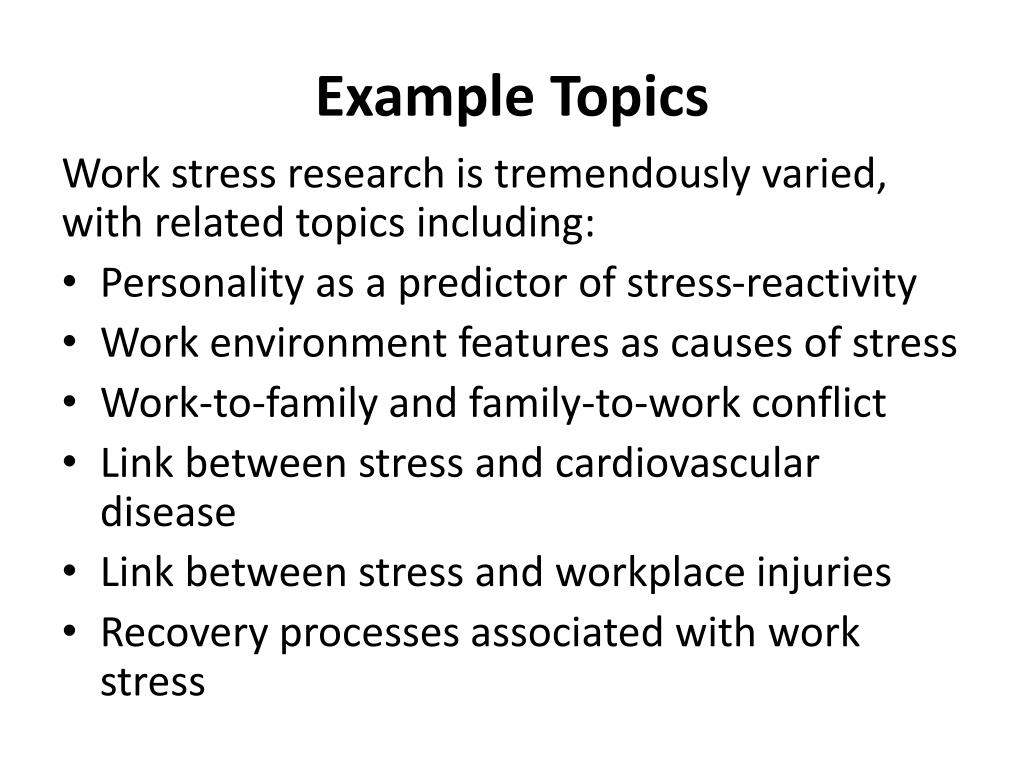 Example Topics Work stress research is tremendously varied, with related topics including: • Personality as a predictor of stress-reactivity • Work environment features as causes of stress • Work-to-family and family-to-work conflict • Link between stress and cardiovascular disease • Link between stress and workplace injuries • Recovery processes associated with work stress