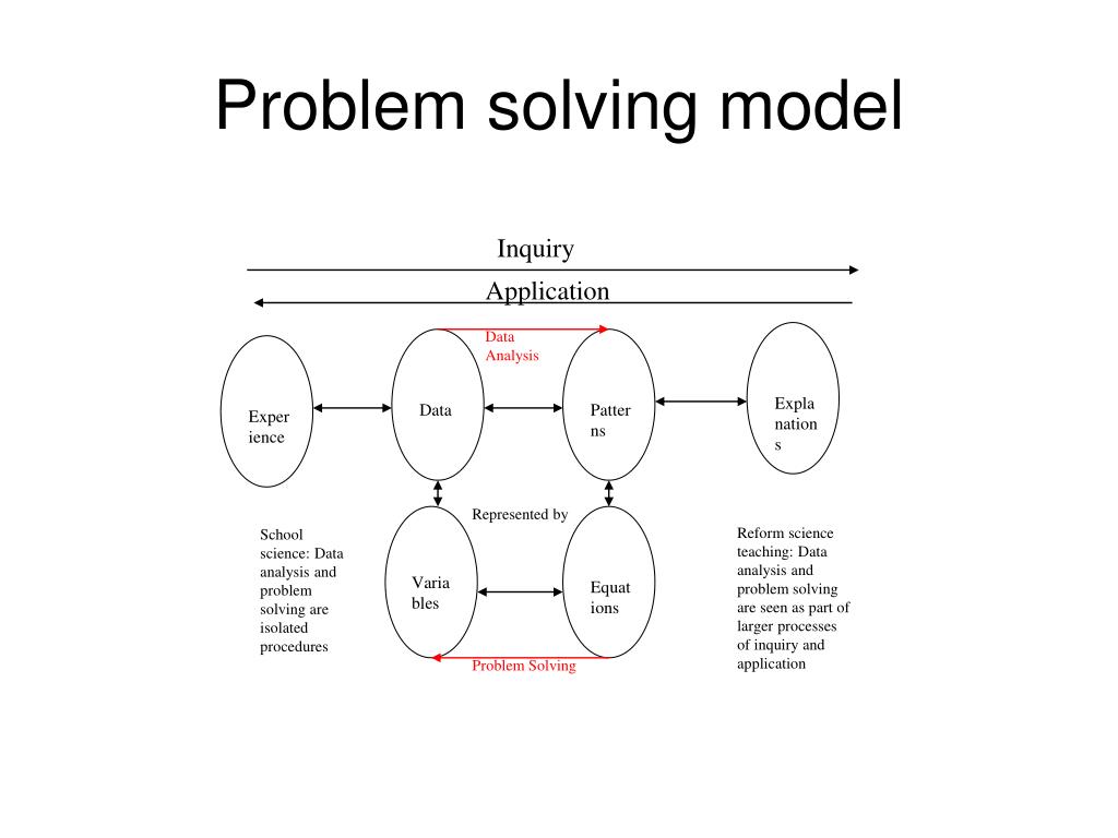 Inquiry Application Data Analysis Explanations Data Patterns Experience Represented by Reform science teaching: Data analysis and problem solving are seen as part of larger processes of inquiry and application School science: Data analysis and problem solving are isolated procedures Variables Equations Problem Solving Problem solving model