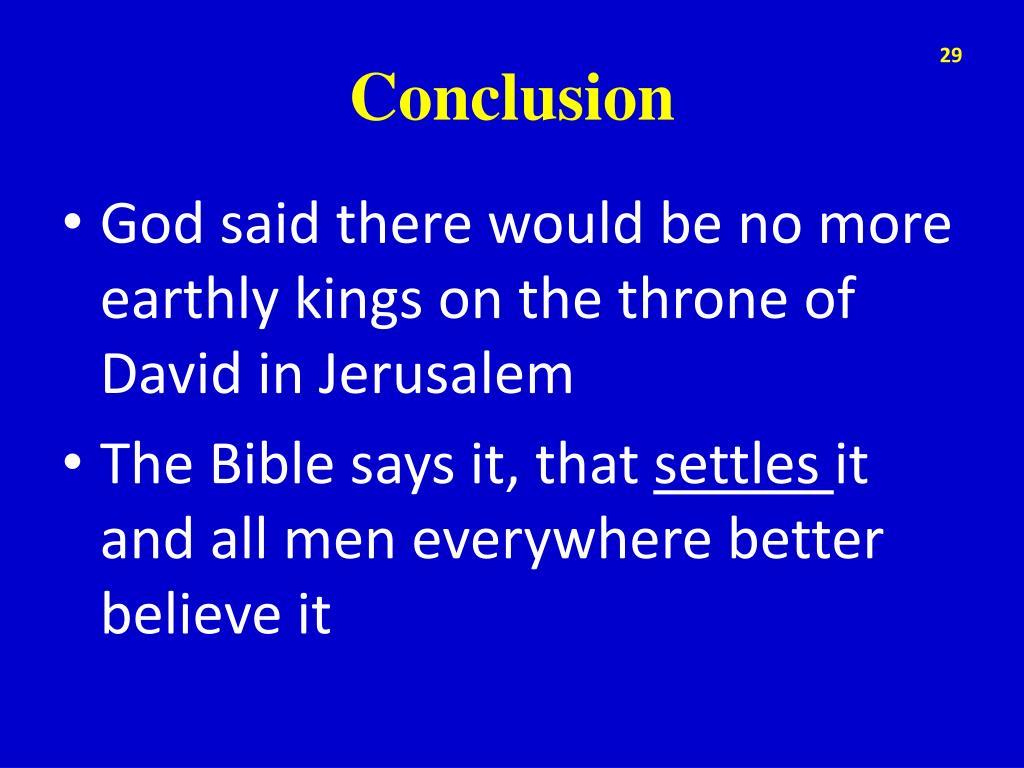 Conclusion God said there would be no more earthly kings on the throne of David in Jerusalem The Bible says it, that settles it and all men everywhere better believe it
