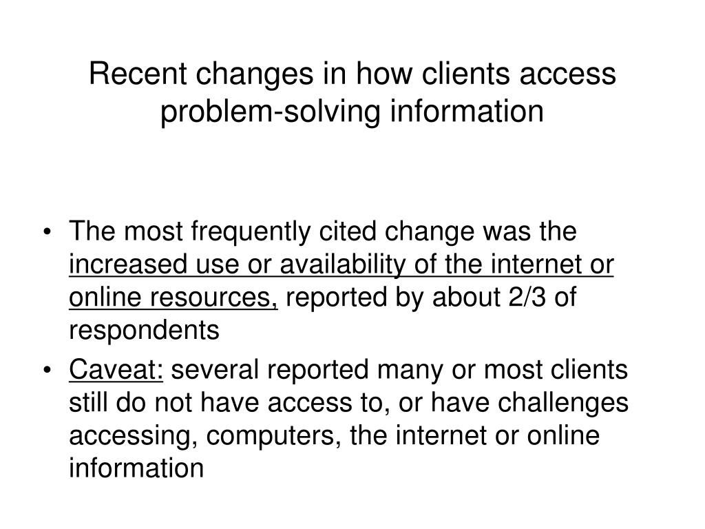 Recent changes in how clients access problem-solving information • The most frequently cited change was the increased use or availability of the internet or online resources, reported by about 2/3 of respondents • Caveat: several reported many or most clients still do not have access to, or have challenges accessing, computers, the internet or online information
