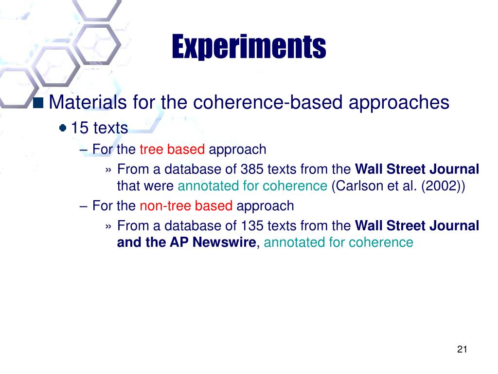 Experiments • Materials for the coherence-based approaches • 15 texts • For the tree based approach • From a database of 385 texts from the Wall Street Journal that were annotated for coherence (Carlson et al. (2002)) • For the non-tree based approach • From a database of 135 texts from the Wall Street Journal and the AP Newswire, annotated for coherence