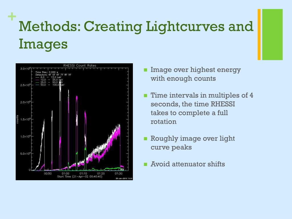 Methods: Creating Lightcurves and Images • Image over highest energy with enough counts • Time intervals in multiples of 4 seconds, the time RHESSI takes to complete a full rotation • Roughly image over light curve peaks • Avoid attenuator shifts