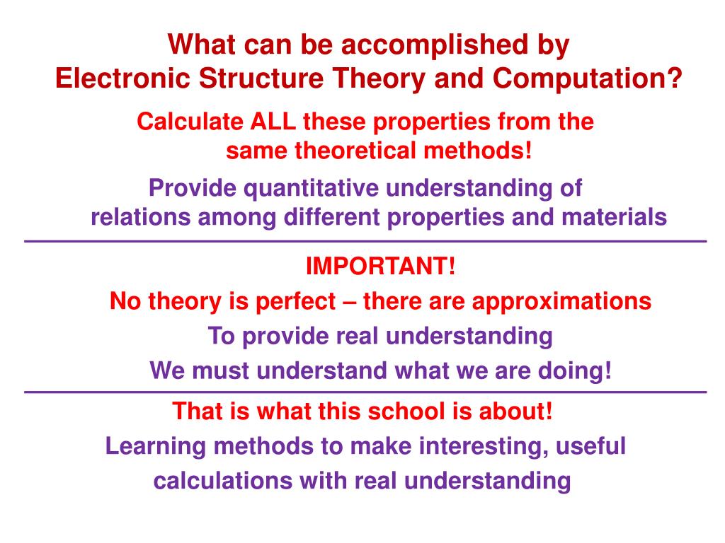 What can be accomplished byElectronic Structure Theory and Computation? Calculate ALL these properties from thesame theoretical methods! Provide quantitative understanding of relations among different properties and materials IMPORTANT! No theory is perfect – there are approximations To provide real understanding We must understand what we are doing! That is what this school is about! Learning methods to make interesting, useful calculations with real understanding