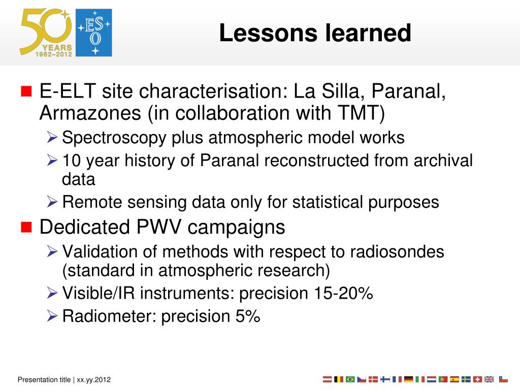 Lessons learned • E-ELT site characterisation: La Silla, Paranal, Armazones (in collaboration with TMT) • Spectroscopy plus atmospheric model works • 10 year history of Paranal reconstructed from archival data • Remote sensing data only for statistical purposes • Dedicated PWV campaigns • Validation of methods with respect to radiosondes (standard in atmospheric research) • Visible/IR instruments: precision 15-20% • Radiometer: precision 5%