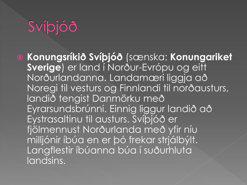 2. Svíþjóð • Konungsríkið Svíþjóð (sænska: Konungariket Sverige) er land í Norður-Evrópu og eitt Norðurlandanna. Landamæri liggja að Noregitil vesturs og Finnlandi til norðausturs, landið tengist Danmörku með Eyrarsundsbrúnni. Einnig liggur landið að Eystrasaltinu til austurs. Svíþjóð er fjölmennust Norðurlanda með yfir níu milljónir íbúa en er þó frekar strjálbýlt. Langflestir íbúanna búa í suðurhluta landsins.