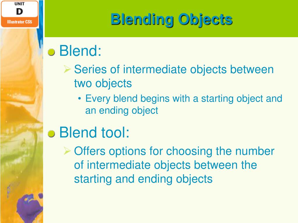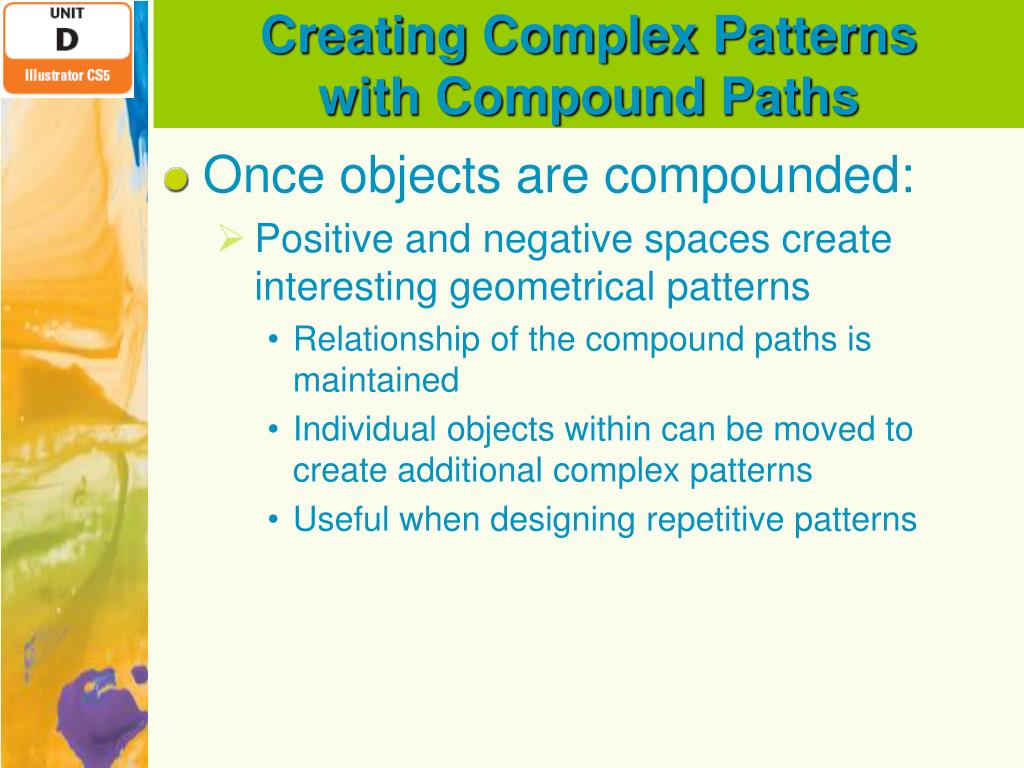 Adobe Illustrator CS5 - Illustrator. Unit D:Creating Blends and Complex Artwork. Objectives. Upon completion of this unit, you should be able to: Use the Divide pathfinder Create compound paths Create complex patterns with compound paths Blend objects Create a clockwise blend