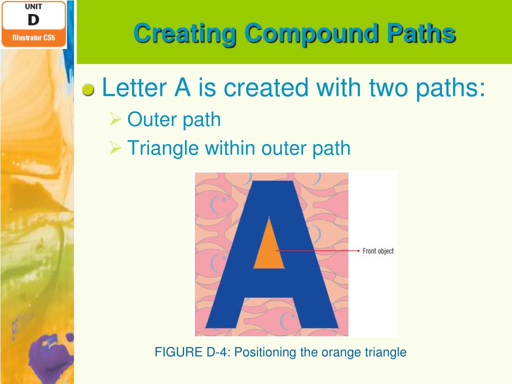 Creating Compound Paths • Letter A is created with two paths: • Outer path • Triangle within outer path FIGURE D-4: Positioning the orange triangle