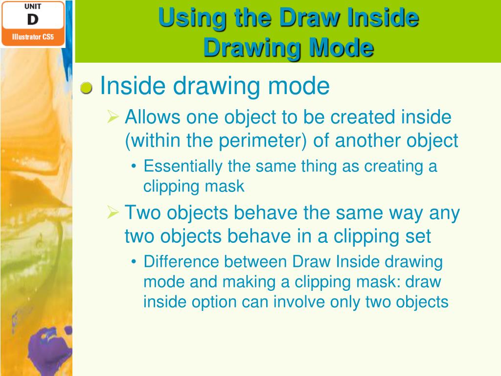 Using the Draw InsideDrawing Mode • Inside drawing mode • Allows one object to be created inside (within the perimeter) of another object • Essentially the same thing as creating a clipping mask • Two objects behave the same way any two objects behave in a clipping set • Difference between Draw Inside drawing mode and making a clipping mask: draw inside option can involve only two objects