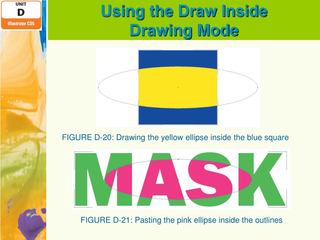 Using the Draw InsideDrawing Mode FIGURE D-20: Drawing the yellow ellipse inside the blue square FIGURE D-21: Pasting the pink ellipse inside the outlines