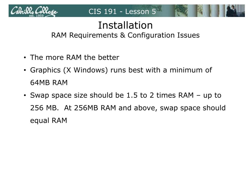 CIS 191 - Lesson 5 Installation RAM Requirements & Configuration Issues • The more RAM the better • Graphics (X Windows) runs best with a minimum of 64MB RAM • Swap space size should be 1.5 to 2 times RAM – up to 256 MB. At 256MB RAM and above, swap space should equal RAM