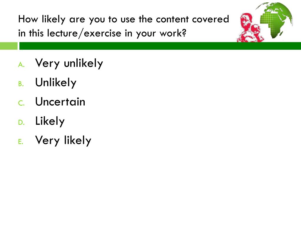 How likely are you to use the content covered in this lecture/exercise in your work? • Very unlikely • Unlikely • Uncertain • Likely • Very likely