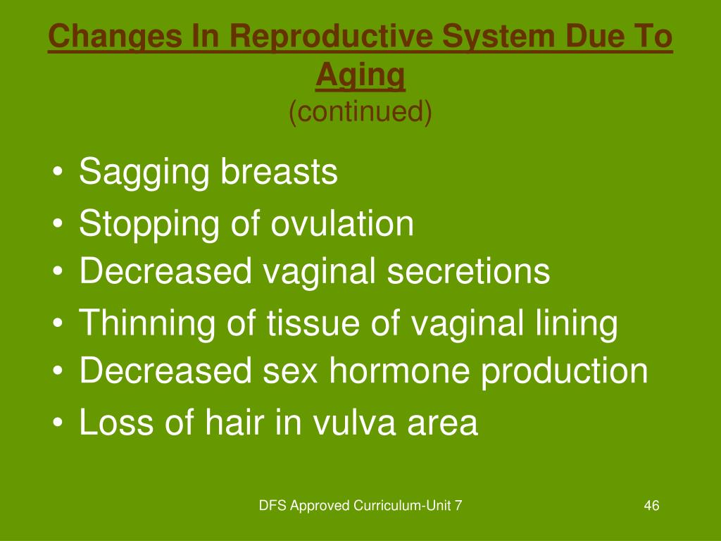 Sagging breasts Stopping of ovulation Decreased vaginal secretions Thinning of tissue of vaginal lining Decreased sex hormone production Loss of hair in vulva area Changes In Reproductive System Due To Aging(continued) DFS Approved Curriculum-Unit 7