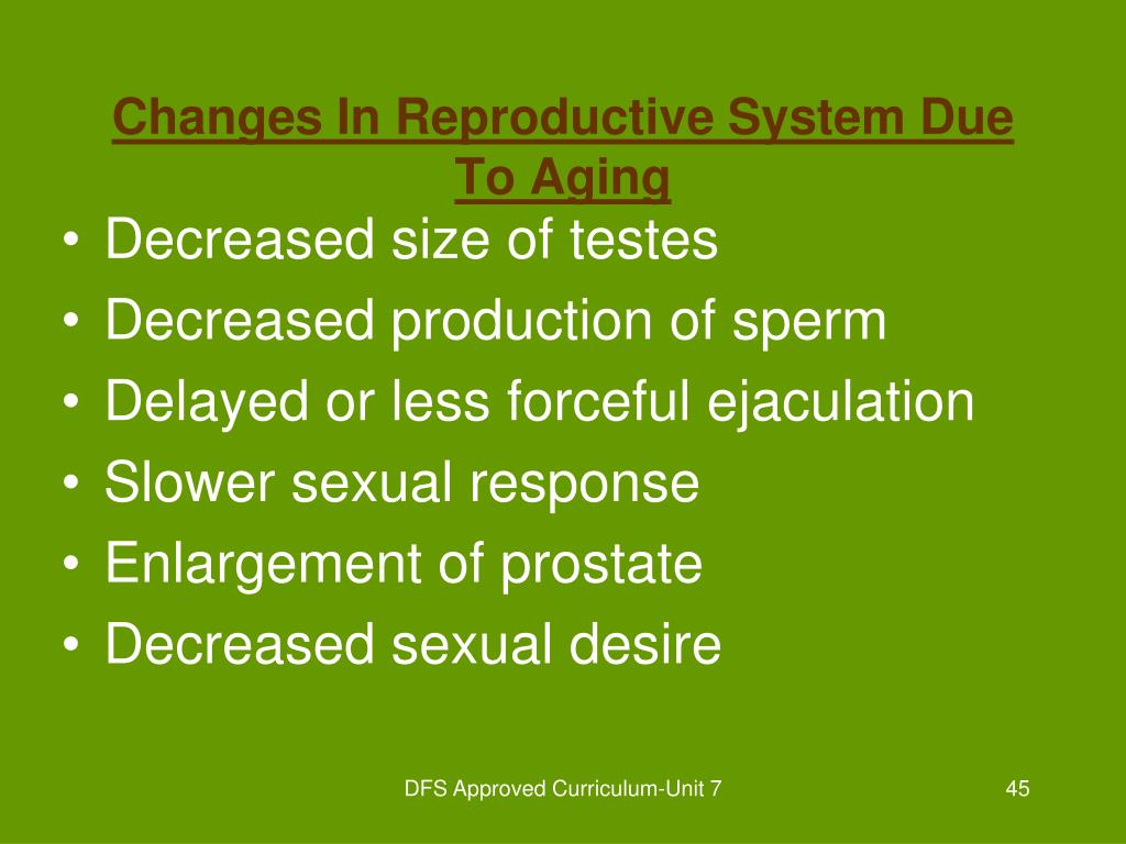 Decreased size of testes Decreased production of sperm Delayed or less forceful ejaculation Slower sexual response Enlargement of prostate Decreased sexual desire Changes In Reproductive System Due To Aging DFS Approved Curriculum-Unit 7