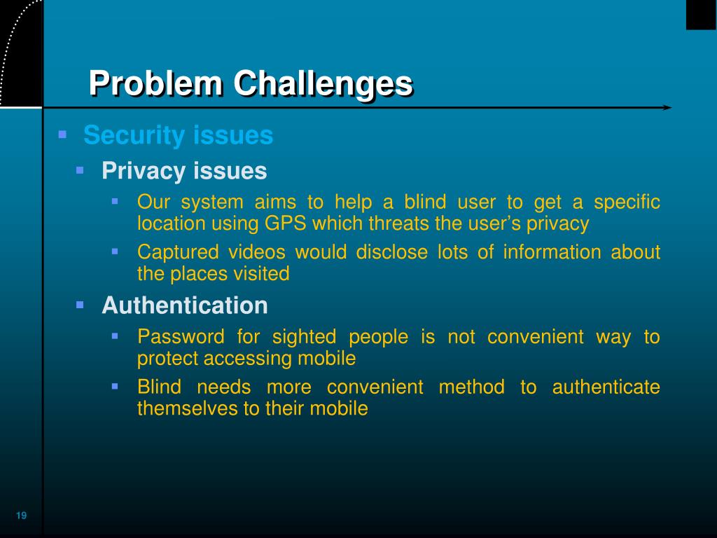 Problem Challenges • Security issues • Privacy issues • Our system aims to help a blind user to get a specific location using GPS which threats the user’s privacy • Captured videos would disclose lots of information about the places visited • Authentication • Password for sighted people is not convenient way to protect accessing mobile • Blind needs more convenient method to authenticate themselves to their mobile