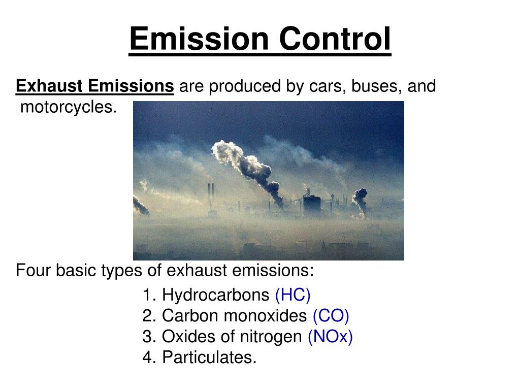 Emission Control. Exhaust Emissions are produced by cars, buses, and motorcycles. Four basic types of exhaust emissions:. Hydrocarbons (HC) Carbon monoxides (CO) Oxides of nitrogen (NOx) Particulates. Emission Control. Hydrocarbons (HC).