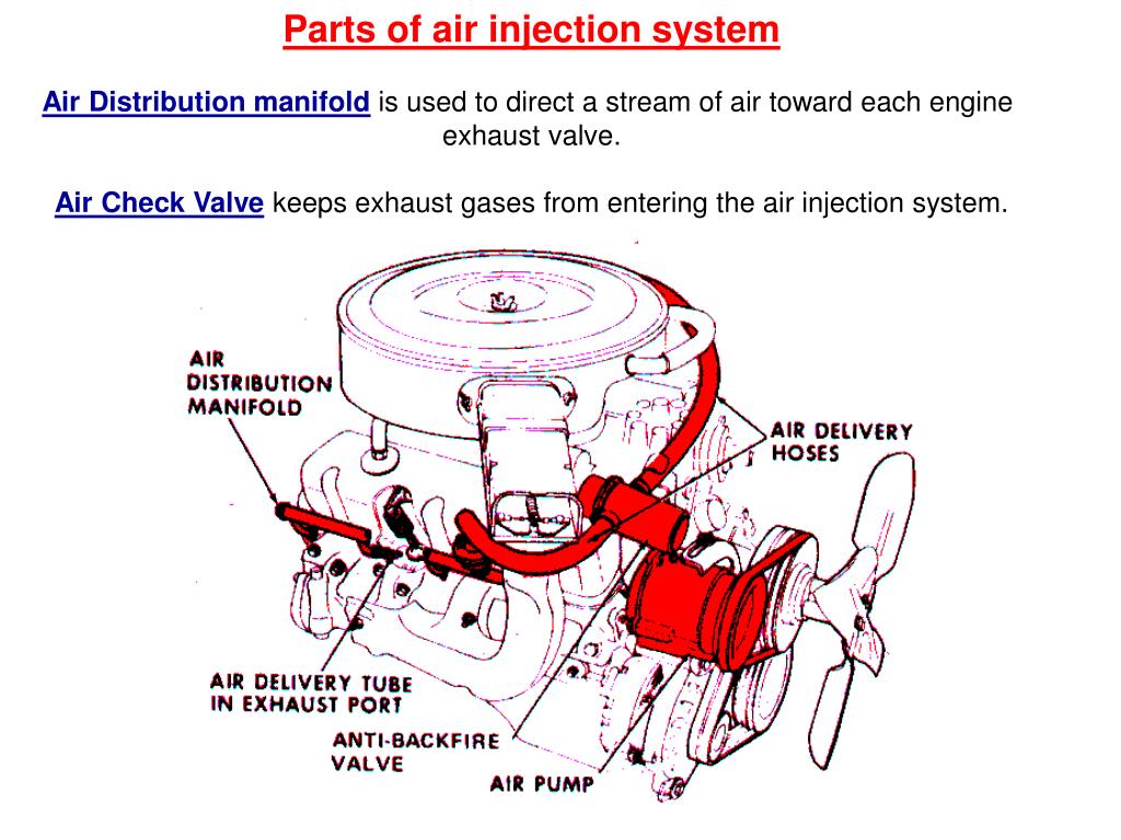 Parts of air injection system Air Injection Pump is belt driven and forces air at low pressure into the system. Diverter Valve keeps air from entering the exhaust system during deceleration.