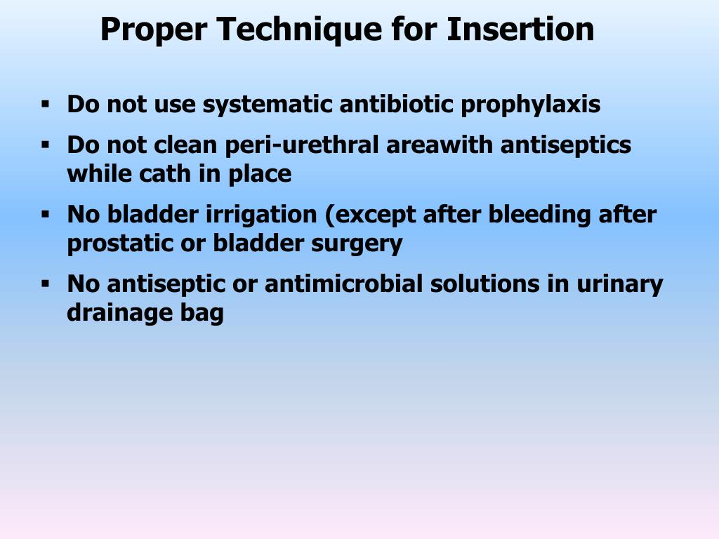 Proper Technique for Insertion • Do not use systematic antibiotic prophylaxis • Do not clean peri-urethral areawith antiseptics while cath in place • No bladder irrigation (except after bleeding after prostatic or bladder surgery • No antiseptic or antimicrobial solutions in urinary drainage bag