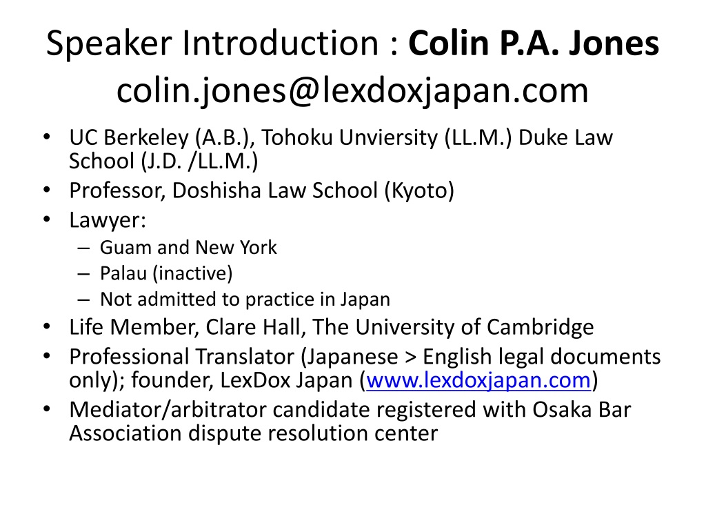 Speaker Introduction : Colin P.A. Jonescolin.jones@lexdoxjapan.com • UC Berkeley (A.B.), Tohoku Unviersity (LL.M.) Duke Law School (J.D. /LL.M.) • Professor, Doshisha Law School (Kyoto) • Lawyer: • Guam and New York • Palau (inactive) • Not admitted to practice in Japan • Life Member, Clare Hall, The University of Cambridge • Professional Translator (Japanese > English legal documents only); founder, LexDox Japan (www.lexdoxjapan.com) • Mediator/arbitrator candidate registered with Osaka Bar Association dispute resolution center