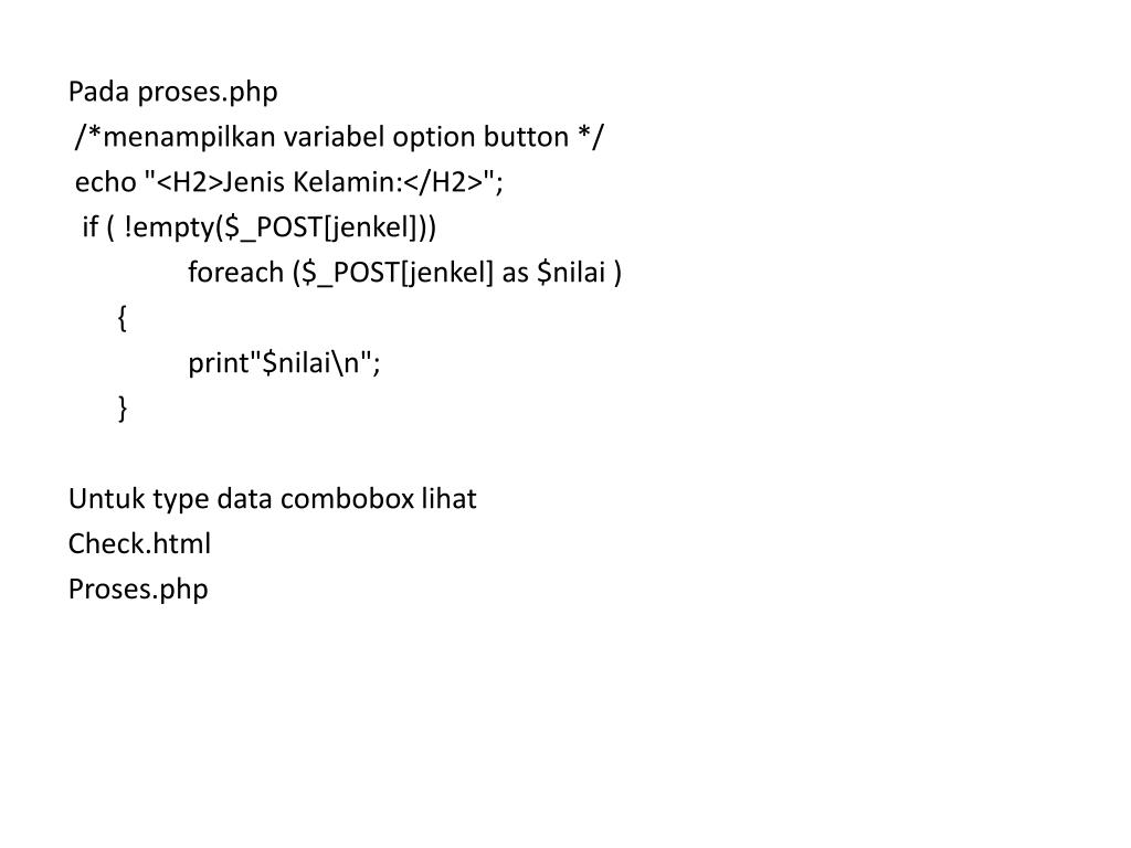 Pada proses.php /*menampilkan variabel option button */ echo "<H2>Jenis Kelamin:</H2>"; if ( !empty($_POST[jenkel])) foreach ($_POST[jenkel] as $nilai ) { print"$nilai\n"; } Untuk type data combobox lihat Check.html Proses.php