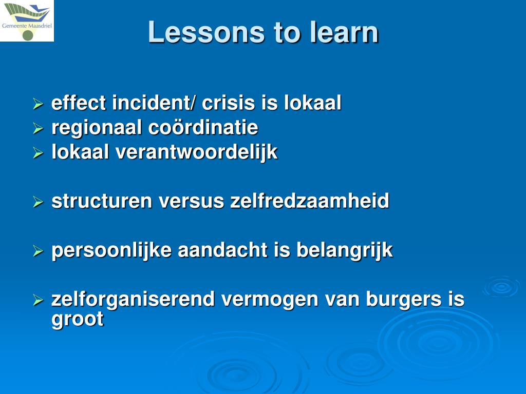 Lessons to learn • effect incident/ crisis is lokaal • regionaal coördinatie • lokaal verantwoordelijk • structuren versus zelfredzaamheid • persoonlijke aandacht is belangrijk • zelforganiserend vermogen van burgers is groot