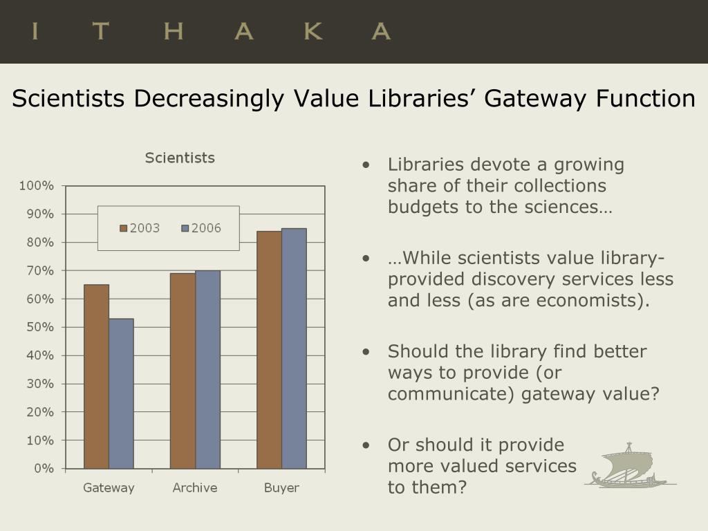 Scientists Decreasingly Value Libraries’ Gateway Function • Libraries devote a growing share of their collections budgets to the sciences… • …While scientists value library-provided discovery services less and less (as are economists). • Should the library find better ways to provide (or communicate) gateway value? • Or should it provide more valued services to them?