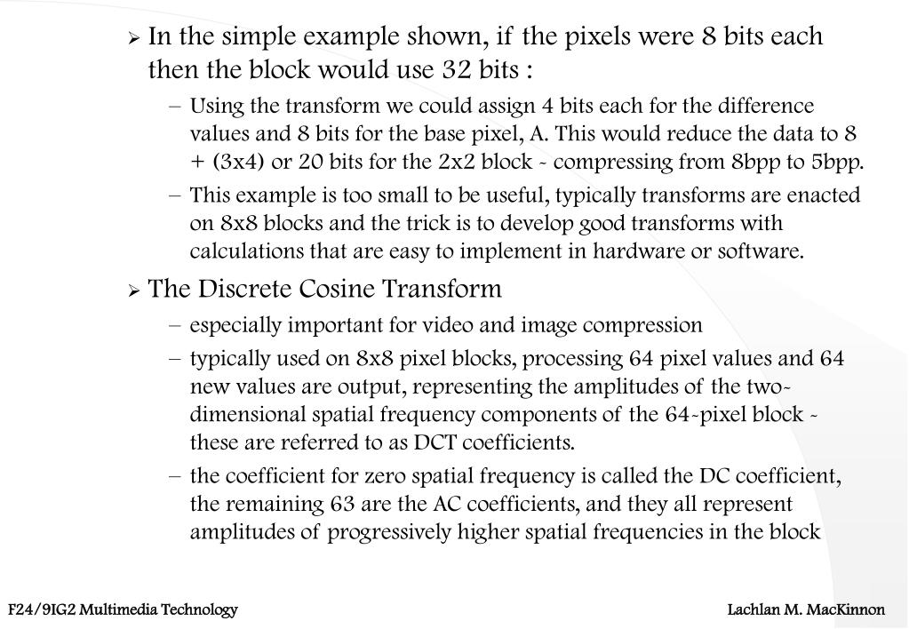 In the simple example shown, if the pixels were 8 bits each then the block would use 32 bits : • Using the transform we could assign 4 bits each for the difference values and 8 bits for the base pixel, A. This would reduce the data to 8 + (3x4) or 20 bits for the 2x2 block - compressing from 8bpp to 5bpp. • This example is too small to be useful, typically transforms are enacted on 8x8 blocks and the trick is to develop good transforms with calculations that are easy to implement in hardware or software. • The Discrete Cosine Transform • especially important for video and image compression • typically used on 8x8 pixel blocks, processing 64 pixel values and 64 new values are output, representing the amplitudes of the two-dimensional spatial frequency components of the 64-pixel block - these are referred to as DCT coefficients. • the coefficient for zero spatial frequency is called the DC coefficient, the remaining 63 are the AC coefficients, and they all represent amplitudes of progressively higher spatial frequencies in the block