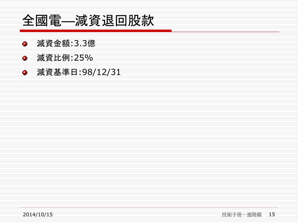 全國電—減資退回股款 • 減資金額:3.3億 • 減資比例:25% • 減資基準日:98/12/31