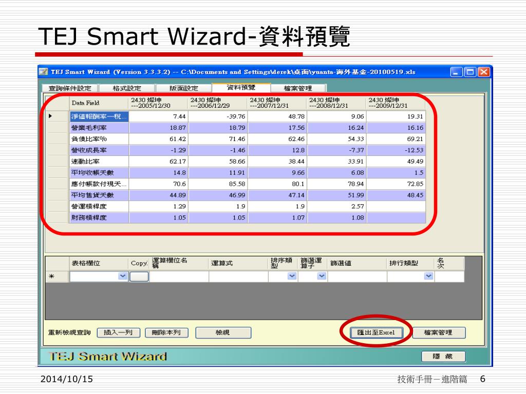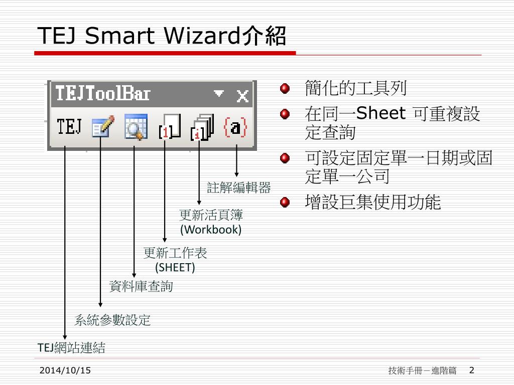 台灣經濟新報 Taiwan Economic Journal. TEJ Smart Wizard 系統介紹及杜邦分析 黃長銘 聯絡電話 : (02)87681088#119 Email: derek@tej.com.tw. 註解編輯器. 更新活頁簿 (Workbook). 更新工作表 (SHEET). 資料庫查詢. 系統參數設定. TEJ 網站連結. TEJ Smart Wizard 介紹. 簡化的工具列 在同一 Sheet 可重複設定查詢 可設定固定單一日期或固定單一公司 增設巨集使用功能.