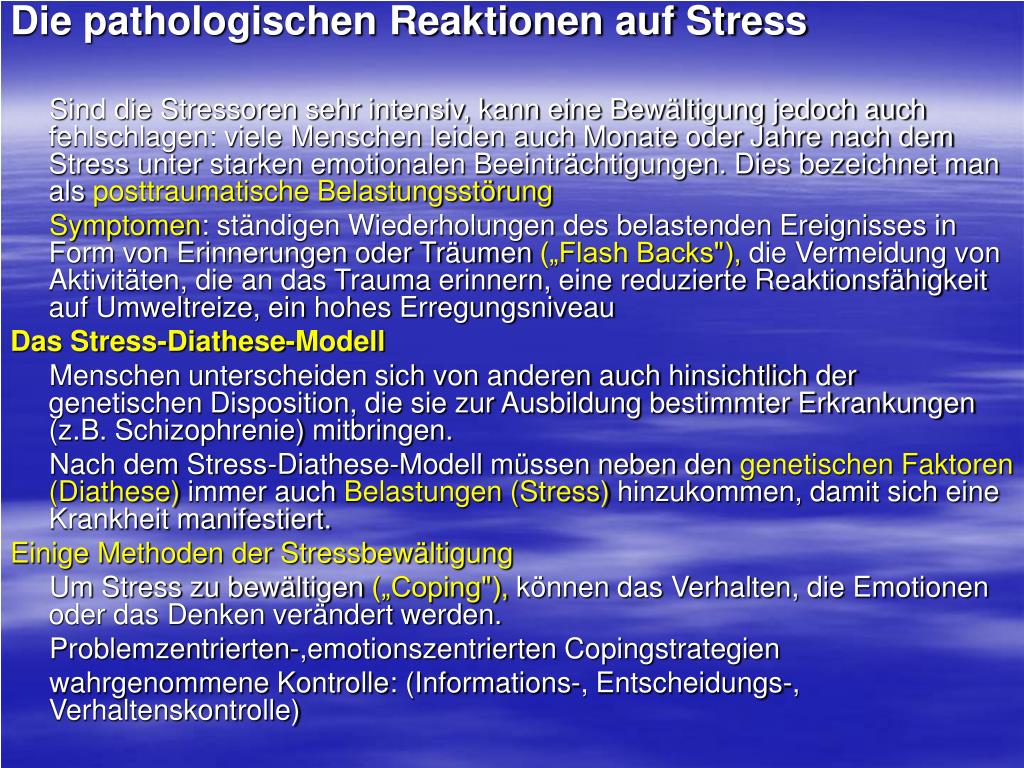 Die pathologischen Reaktionen auf Stress Sind die Stressoren sehr intensiv, kann eine Bewältigung jedoch auch fehlschlagen: viele Menschen leiden auch Monate oder Jahre nach dem Stress unter starken emotionalen Beeinträchtigungen. Dies bezeichnet man als posttraumatische Belastungsstörung Symptomen: ständigen Wiederholungen des belastenden Ereignisses in Form von Erinnerungen oder Träumen („Flash Backs"), die Vermeidung von Aktivitäten, die an das Trauma erinnern, eine reduzierte Reaktionsfähigkeit auf Umweltreize, ein hohes Erregungsniveau Das Stress-Diathese-Modell Menschen unterscheiden sich von anderen auch hinsichtlich der genetischen Disposition, die sie zur Ausbildung bestimmter Erkrankungen (z.B. Schizophrenie) mitbringen. Nach dem Stress-Diathese-Modell müssen neben den genetischen Faktoren(Diathese) immer auch Belastungen (Stress) hinzukommen, damit sich eine Krankheit manifestiert. Einige Methoden der Stressbewältigung Um Stress zu bewältigen („Coping"), können das Verhalten, die Emotionen oder das Denken verändert werden. Problemzentrierten-,emotionszentrierten Copingstrategien wahrgenommene Kontrolle: (Informations-, Entscheidungs-, Verhaltenskontrolle)