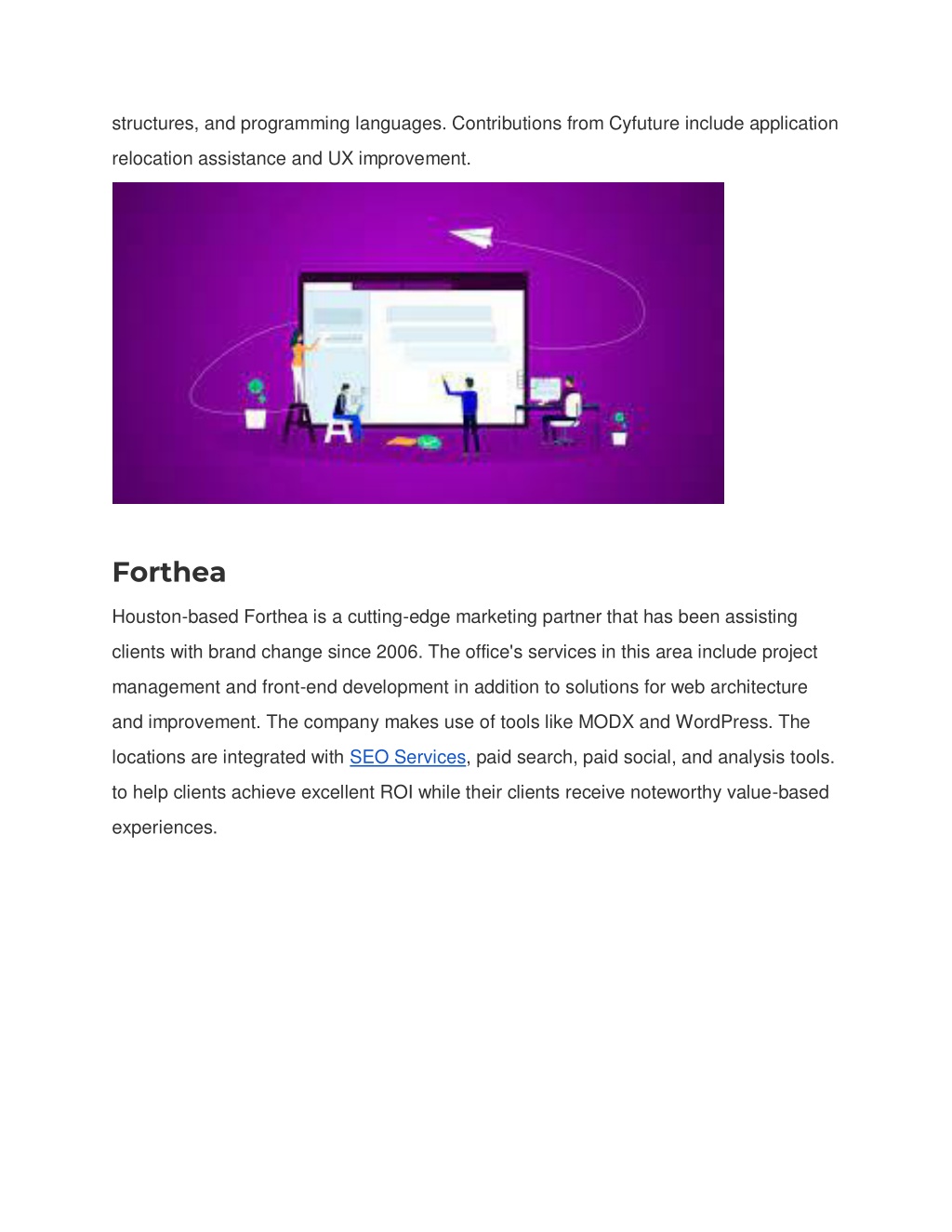 structures, and programming languages. Contributions from Cyfuture include application relocation assistance and UX improvement. Forthea Houston-based Forthea is a cutting-edge marketing partner that has been assisting clients with brand change since 2006. The office's services in this area include project management and front-end development in addition to solutions for web architecture and improvement. The company makes use of tools like MODX and WordPress. The locations are integrated with SEO Services, paid search, paid social, and analysis tools. to help clients achieve excellent ROI while their clients receive noteworthy value-based experiences.