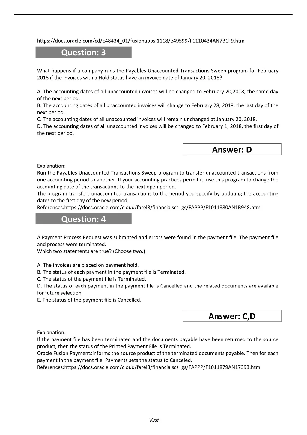 https://docs.oracle.com/cd/E48434_01/fusionapps.1118/e49599/F1110434AN7B1F9.htm Question: 3 What happens if a company runs the Payables Unaccounted Transactions Sweep program for February 2018 if the invoices with a Hold status have an invoice date of January 20, 2018? A. The accounting dates of all unaccounted invoices will be changed to February 20,2018, the same day of the next period. B. The accounting dates of all unaccounted invoices will change to February 28, 2018, the last day of the next period. C. The accounting dates of all unaccounted invoices will remain unchanged at January 20, 2018. D. The accounting dates of all unaccounted invoices will be changed to February 1, 2018, the first day of the next period. Answer: D Explanation: Run the Payables Unaccounted Transactions Sweep program to transfer unaccounted transactions from one accounting period to another. If your accounting practices permit it, use this program to change the accounting date of the transactions to the next open period. The program transfers unaccounted transactions to the period you specify by updating the accounting dates to the first day of the new period. References:https://docs.oracle.com/cloud/farel8/financialscs_gs/FAPPP/F1011880AN1B948.htm Question: 4 A Payment Process Request was submitted and errors were found in the payment file. The payment file and process were terminated. Which two statements are true? (Choose two.) A. The invoices are placed on payment hold. B. The status of each payment in the payment file is Terminated. C. The status of the payment file is Terminated. D. The status of each payment in the payment file is Cancelled and the related documents are available for future selection. E. The status of the payment file is Cancelled. Answer: C,D Explanation: If the payment file has been terminated and the documents payable have been returned to the source product, then the status of the Printed Payment File is Terminated. Oracle Fusion Paymentsinforms the source product of the terminated documents payable. Then for each payment in the payment file, Payments sets the status to Canceled. References:https://docs.oracle.com/cloud/farel8/financialscs_gs/FAPPP/F1011879AN17393.htm Visit