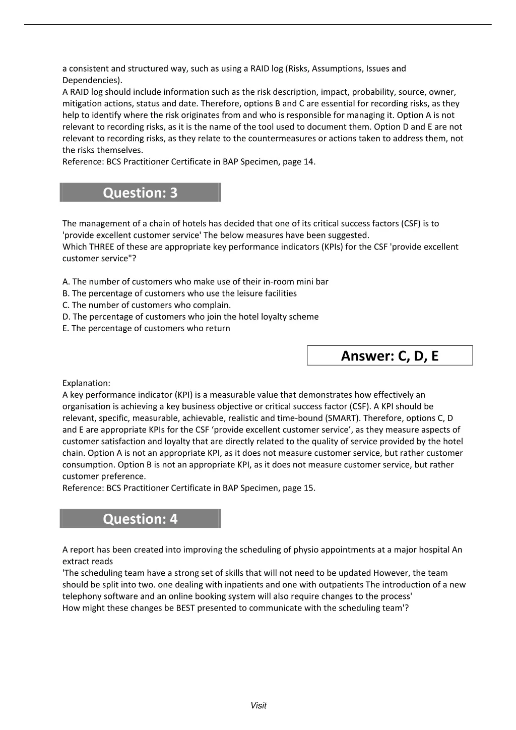 a consistent and structured way, such as using a RAID log (Risks, Assumptions, Issues and Dependencies). A RAID log should include information such as the risk description, impact, probability, source, owner, mitigation actions, status and date. Therefore, options B and C are essential for recording risks, as they help to identify where the risk originates from and who is responsible for managing it. Option A is not relevant to recording risks, as it is the name of the tool used to document them. Option D and E are not relevant to recording risks, as they relate to the countermeasures or actions taken to address them, not the risks themselves. Reference: BCS Practitioner Certificate in BAP Specimen, page 14. Question: 3 The management of a chain of hotels has decided that one of its critical success factors (CSF) is to 'provide excellent customer service' The below measures have been suggested. Which THREE of these are appropriate key performance indicators (KPIs) for the CSF 'provide excellent customer service"? A. The number of customers who make use of their in-room mini bar B. The percentage of customers who use the leisure facilities C. The number of customers who complain. D. The percentage of customers who join the hotel loyalty scheme E. The percentage of customers who return Answer: C, D, E Explanation: A key performance indicator (KPI) is a measurable value that demonstrates how effectively an organisation is achieving a key business objective or critical success factor (CSF). A KPI should be relevant, specific, measurable, achievable, realistic and time-bound (SMART). Therefore, options C, D and E are appropriate KPIs for the CSF ‘provide excellent customer service’, as they measure aspects of customer satisfaction and loyalty that are directly related to the quality of service provided by the hotel chain. Option A is not an appropriate KPI, as it does not measure customer service, but rather customer consumption. Option B is not an appropriate KPI, as it does not measure customer service, but rather customer preference. Reference: BCS Practitioner Certificate in BAP Specimen, page 15. Question: 4 A report has been created into improving the scheduling of physio appointments at a major hospital An extract reads 'The scheduling team have a strong set of skills that will not need to be updated However, the team should be split into two. one dealing with inpatients and one with outpatients The introduction of a new telephony software and an online booking system will also require changes to the process' How might these changes be BEST presented to communicate with the scheduling team'? Visit