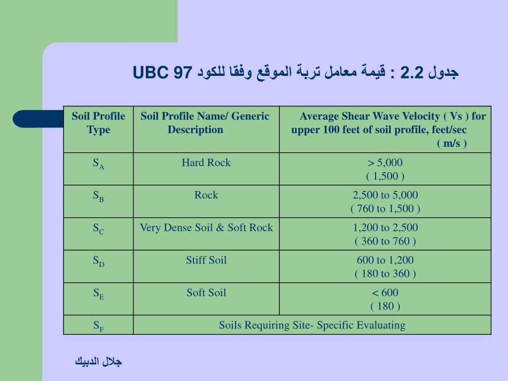 جدول 2.2 : قيمة معامل تربة الموقع وفقا للكود UBC 97 جلال الدبيك