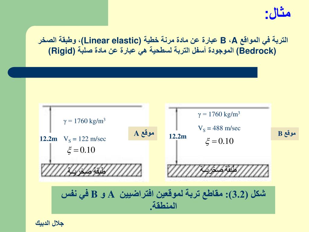 مثال: γ = 1760 kg/m3 γ = 1760 kg/m3 موقع A VS = 488 m/sec 12.2m VS = 122 m/sec موقع B 12.2m التربة في المواقع A، B عبارة عن مادة مرنة خطية (Linear elastic)، وطبقة الصخر (Bedrock) الموجودة أسفل التربة لسطحية هي عبارة عن مادة صلبة (Rigid) شكل (3.2): مقاطع تربة لموقعين افتراضيين A و B في نفس المنطقة. جلال الدبيك