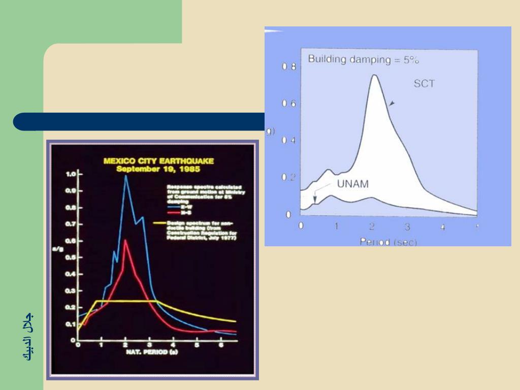 زلزال المكسيك، 1985كانت درجته M8.1 • الموقع UNAM: تتكون تربته من الصخر • الموقع SCT: تتكون تربتة من طبقة من الطين الرخو (Soft clay) يترواح عمقها بين 35-40 متر، ومعدل سرعة الموجات القاصة في هذه الطبقة 75m/sec تقريباً. جلال الدبيك