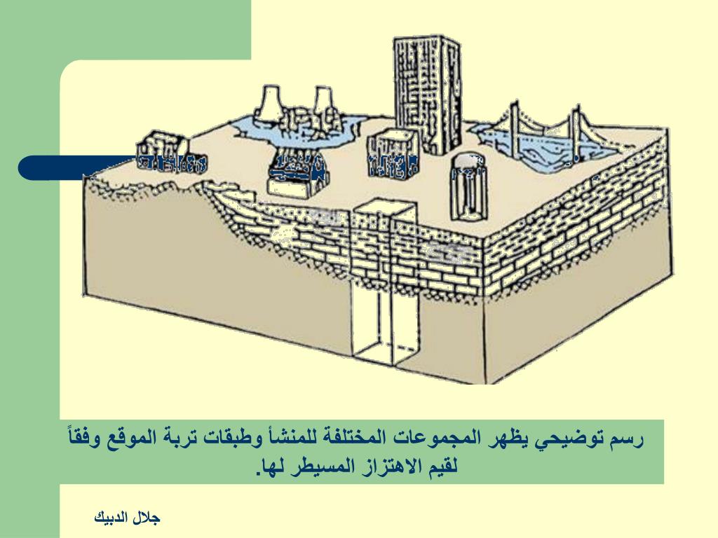 رسم توضيحي يظهر المجموعات المختلفة للمنشأ وطبقات تربة الموقع وفقاً لقيم الاهتزاز المسيطر لها. جلال الدبيك