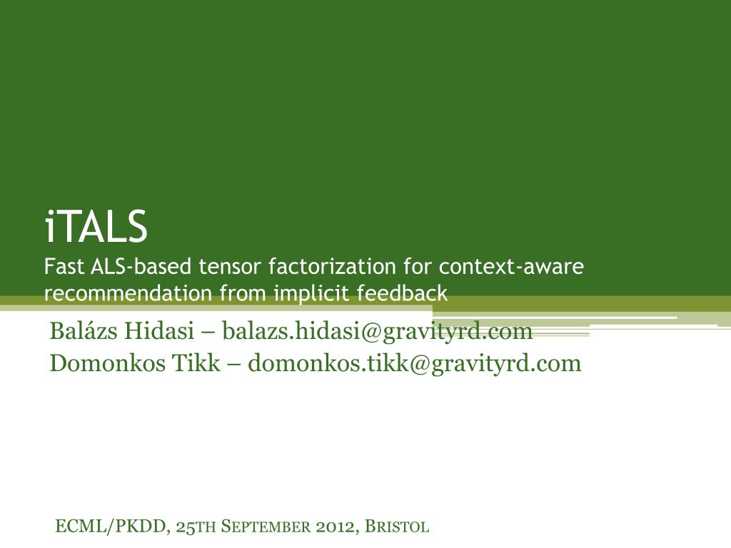 iTALSFast ALS-based tensor factorization for context-aware recommendation from implicit feedback Balázs Hidasi – balazs.hidasi@gravityrd.com Domonkos Tikk – domonkos.tikk@gravityrd.com ECML/PKDD, 25th September 2012, Bristol