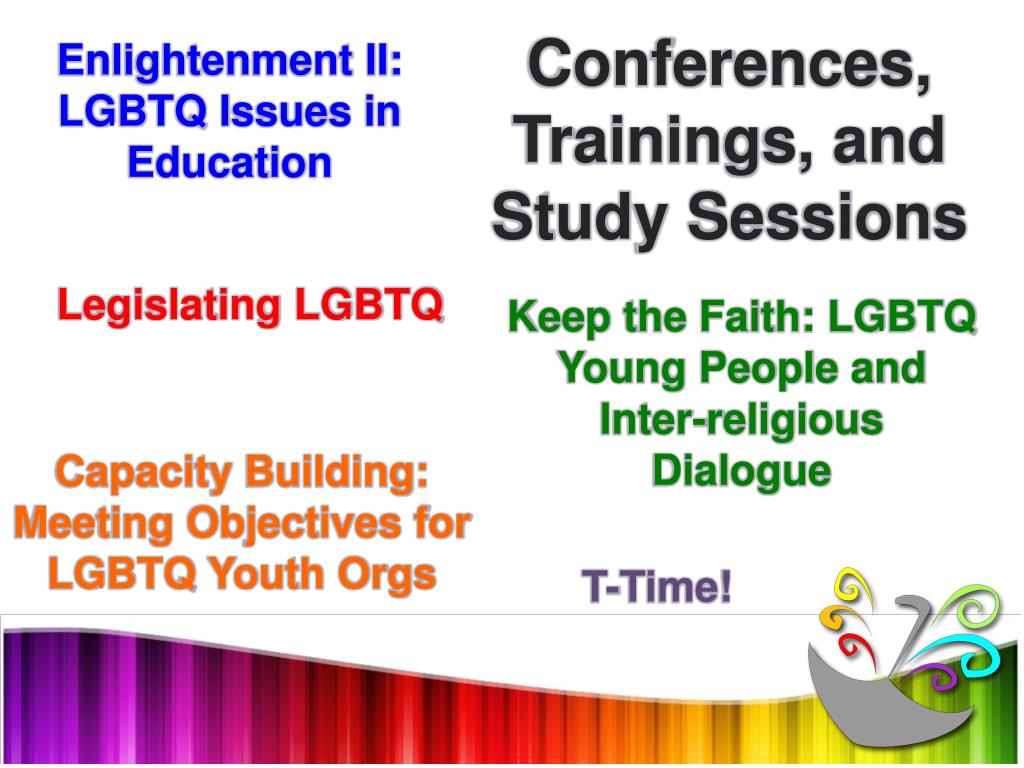 Enlightenment II: LGBTQ Issues in Education Conferences, Trainings, and Study Sessions Legislating LGBTQ Keep the Faith: LGBTQ Young People and Inter-religious Dialogue Capacity Building: Meeting Objectives for LGBTQ Youth Orgs T-Time!
