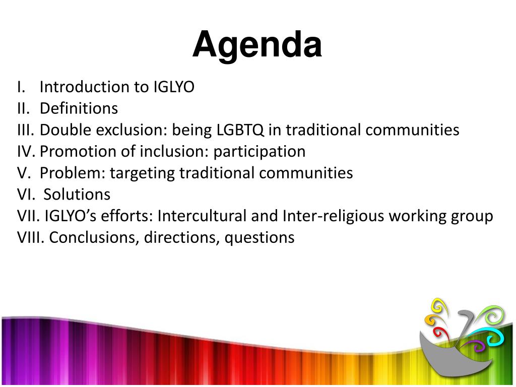 Agenda Introduction to IGLYO Definitions Double exclusion: being LGBTQ in traditional communities Promotion of inclusion: participation Problem: targeting traditional communities Solutions IGLYO’s efforts: Intercultural and Inter-religious working group Conclusions, directions, questions