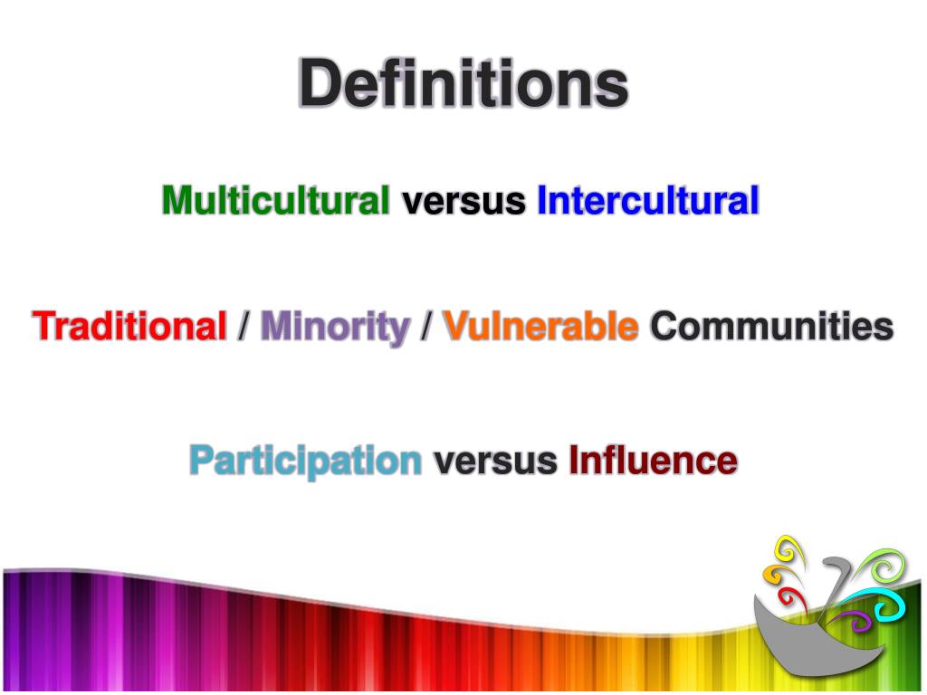 Definitions Multicultural versusIntercultural Traditional/ Minority / Vulnerable Communities Participation versus Influence