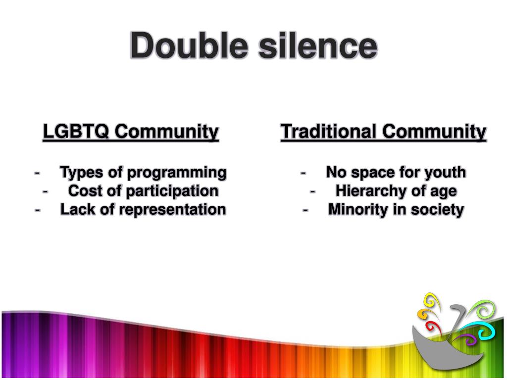 Double silence • LGBTQ Community • Types of programming • Cost of participation • Lack of representation • Traditional Community • No space for youth • Hierarchy of age • Minority in society