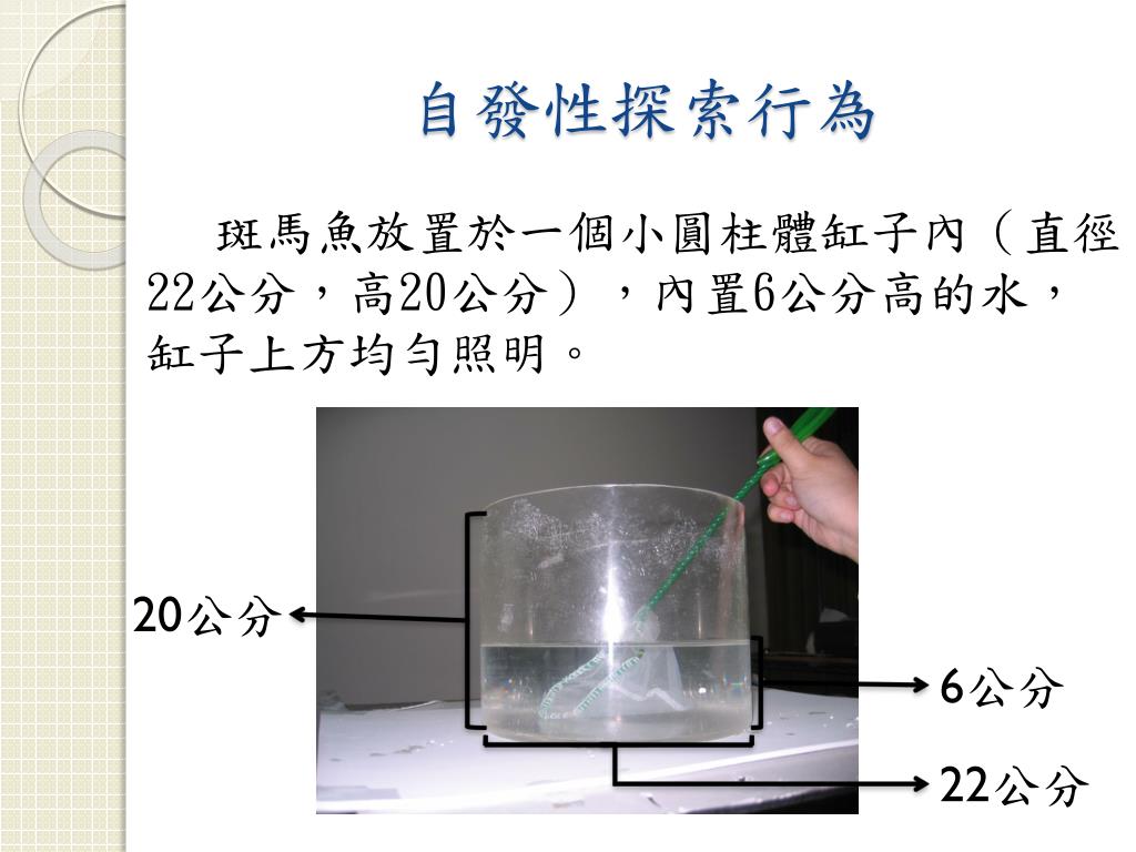 自發性探索行為 斑馬魚放置於一個小圓柱體缸子內(直徑22公分,高20公分),內置6公分高的水,缸子上方均勻照明。 20公分 6公分 22公分