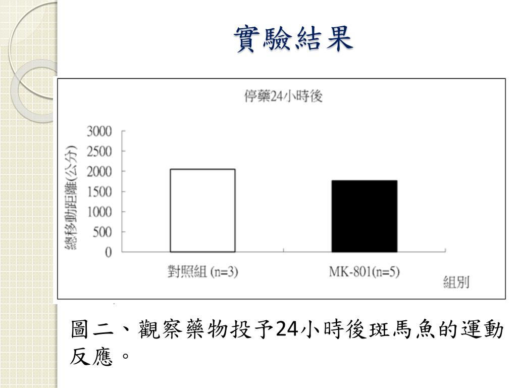實驗結果 圖二、觀察藥物投予24小時後斑馬魚的運動反應。