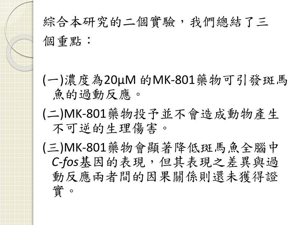 綜合本研究的二個實驗,我們總結了三 個重點: (一)濃度為20μM 的MK-801藥物可引發斑馬魚的過動反應。 (二)MK-801藥物投予並不會造成動物產生不可逆的生理傷害。 (三)MK-801藥物會顯著降低斑馬魚全腦中C-fos基因的表現,但其表現之差異與過動反應兩者間的因果關係則還未獲得證實。