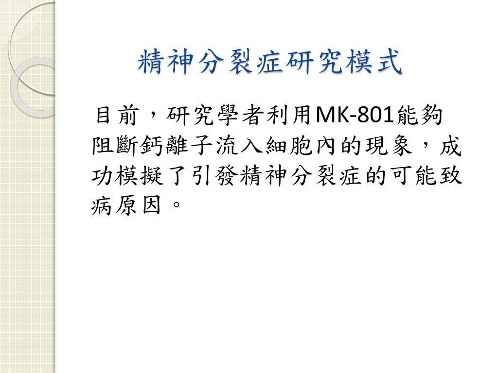 精神分裂症研究模式 目前,研究學者利用MK-801能夠阻斷鈣離子流入細胞內的現象,成功模擬了引發精神分裂症的可能致病原因。