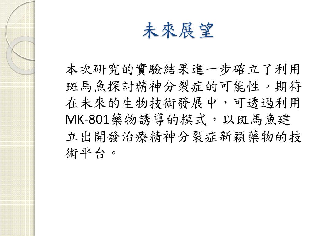 未來展望 本次研究的實驗結果進一步確立了利用斑馬魚探討精神分裂症的可能性。期待在未來的生物技術發展中,可透過利用MK-801藥物誘導的模式,以斑馬魚建立出開發治療精神分裂症新穎藥物的技術平台。