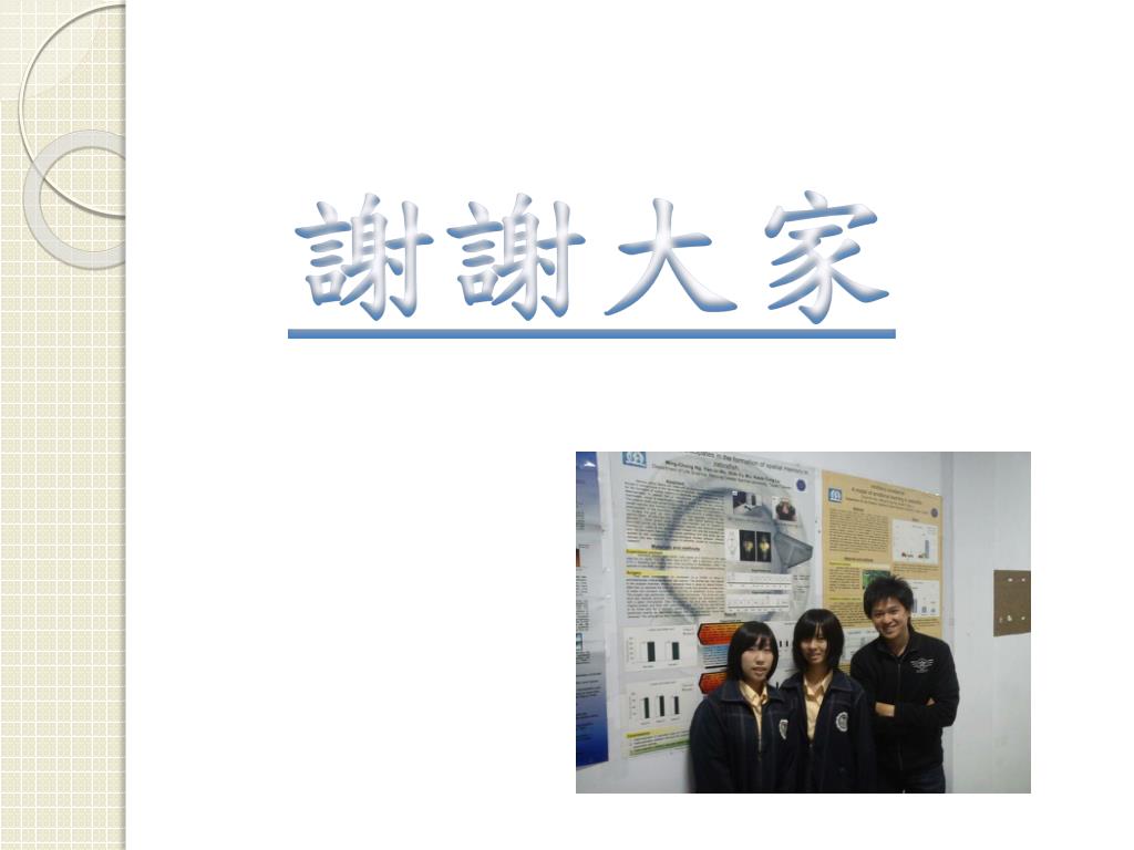 致謝 首先 要感謝學校和呂國棟教授提供我們這個難得的機會 讓我們去能到大學做實驗 並使我們提早了解自己的興趣及未來目標 謝謝這幾個月來帶著我們做實驗 指導我們專業知識和實驗技術的吳民聰老師 儘管我們有許多不懂的地方 他仍不厭其煩的細心指導 也謝謝在校內幫助我們許多的蔡緻怡老師 在我們製作簡報時細心耐心的提醒