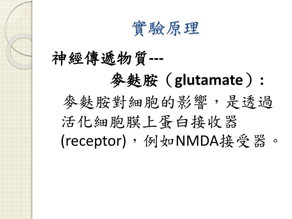 實驗原理 神經傳遞物質--- 麥麩胺(glutamate): 麥麩胺對細胞的影響,是透過活化細胞膜上蛋白接收器(receptor),例如NMDA接受器。